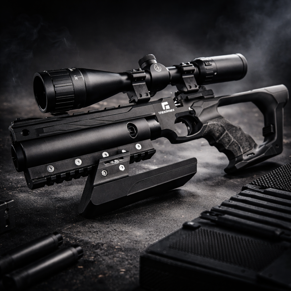 Projetado para a carabina de pressão Reximex RP. Todas as versões são fornecidas na cor preta, independentemente do material.